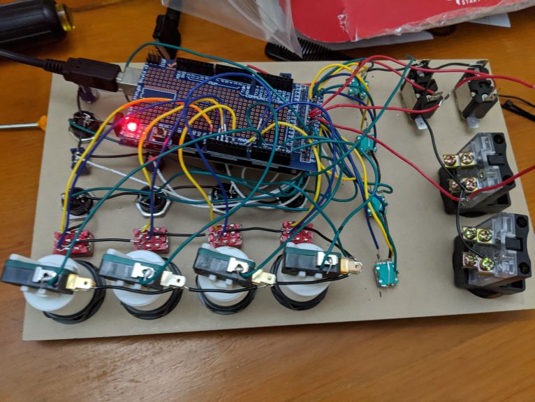 I made a button box which allows me to run code on my computer from the push of a button. I mostly use it for simulation games on my computer. It uses an Arduino Mega and sends messages over a serial usb to my windows machine. Future upgrades could be a native USB driver interface and proper soldering board.